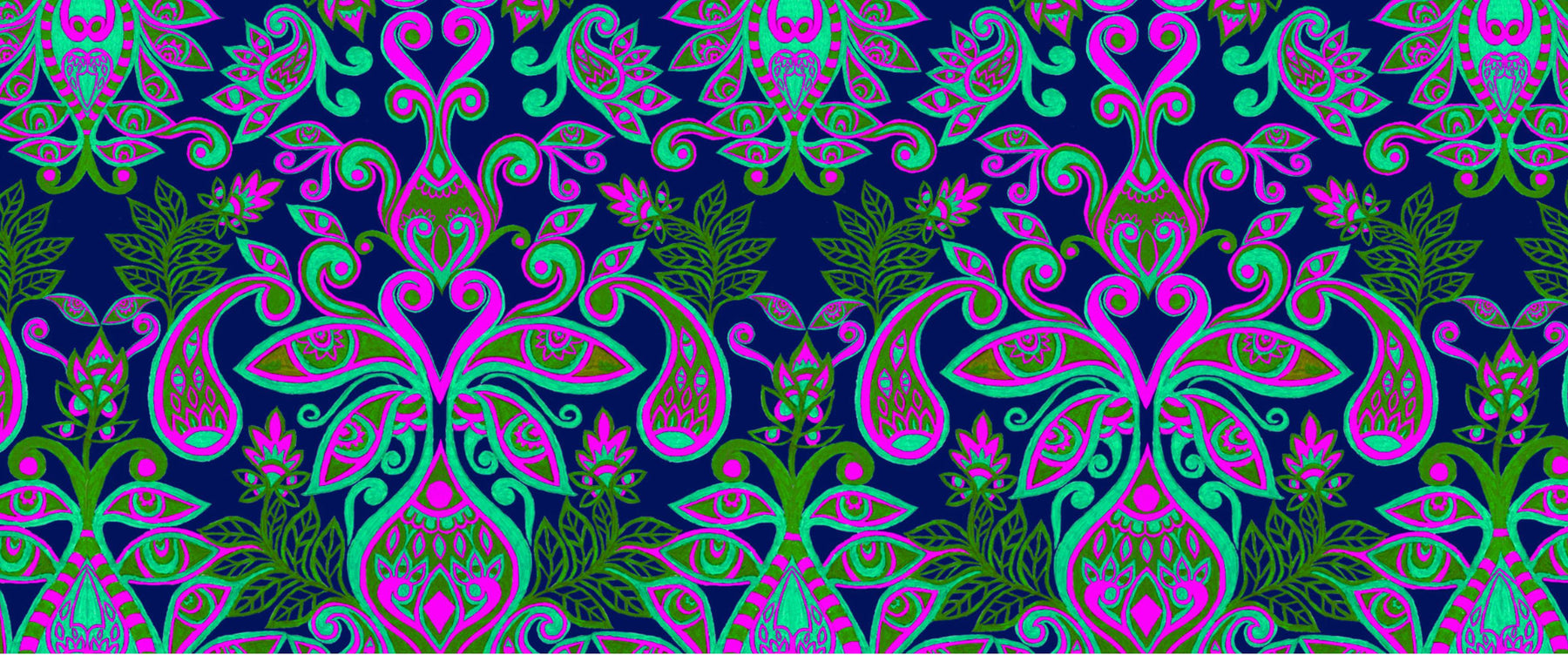 Our lates print design ‘Trippy Paisley print’ was inspired by the magical moving wallpaper in the original 1960s film The Haunting, which cleverly displayed optical illusions of faces and eyes moving within the print of the wallpaper. This bold and striking print fuses together the traditional paisley pattern mixed with a playful optical illusion of eyes within the print design which is truly unique, giving this design a rather mystical feel.